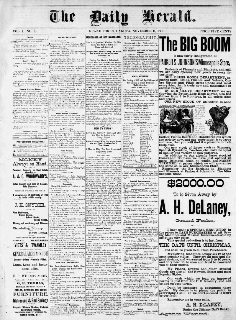 On November 11, 1881, the Grand Forks Herald reported a remarkable surge in business at the Grand Forks land office, which has significantly outpaced activity in nearby Fargo. The overwhelming demand for land has left the office staff struggling to manage the influx, as sales figures far exceed expectations, marking a notable moment in the region’s economic history.