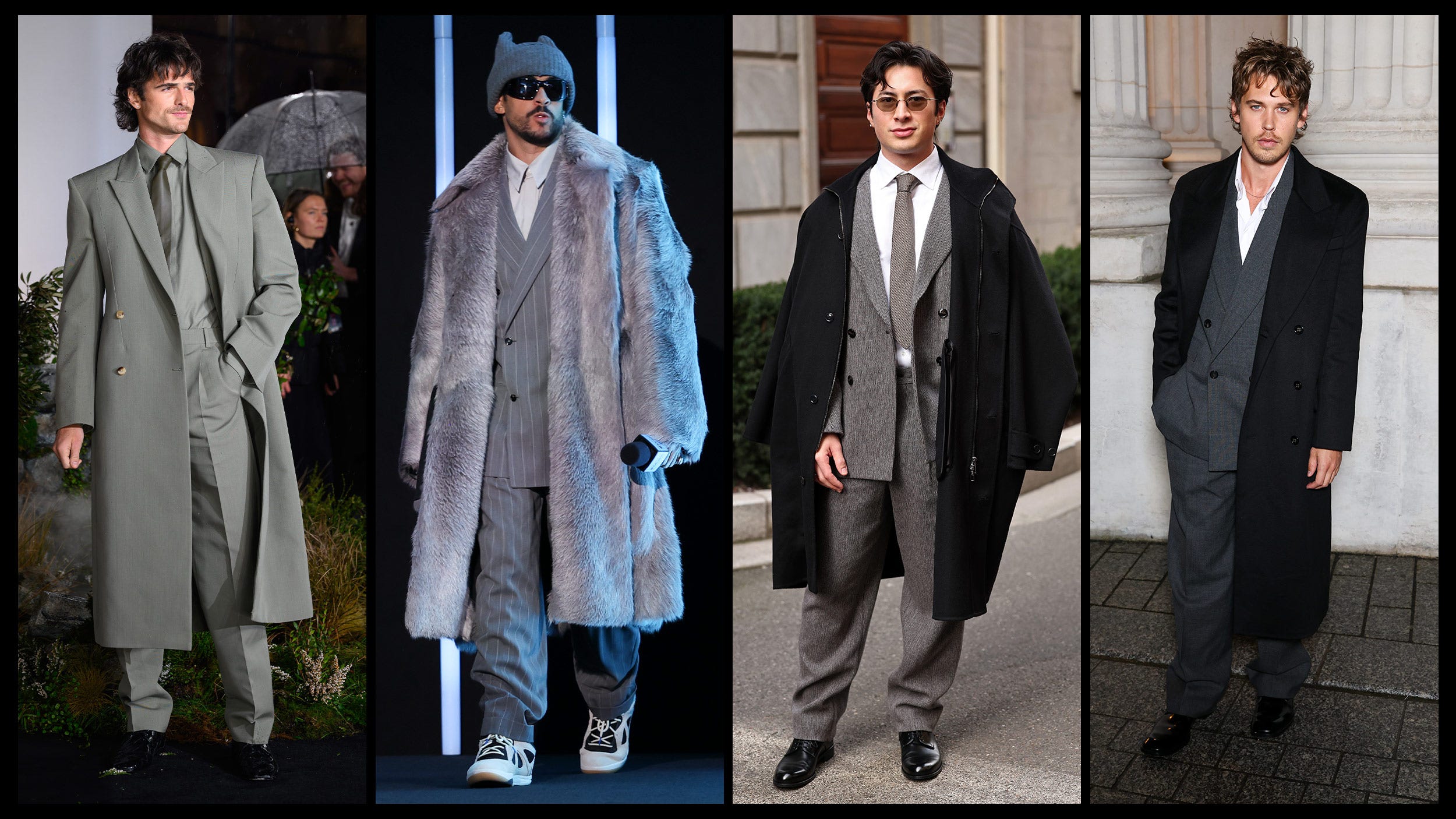 Not to be overlooked, Bad Bunny embraced the gray suit trend with his unique maximalist approach. Ahead of his Super Bowl LX halftime performance, the acclaimed artist arrived in San Francisco sporting a loose pinstripe gray suit, paired with a white collared shirt and an oversized shearling coat in a shimmering gray. His unreleased Adidas BadBo 1.0 sneakers, alongside black shades and a playful ribbed gray beanie, transformed the sophisticated aesthetic into something distinctly his own, bridging yuppie style with Puerto Rican cultural elements.