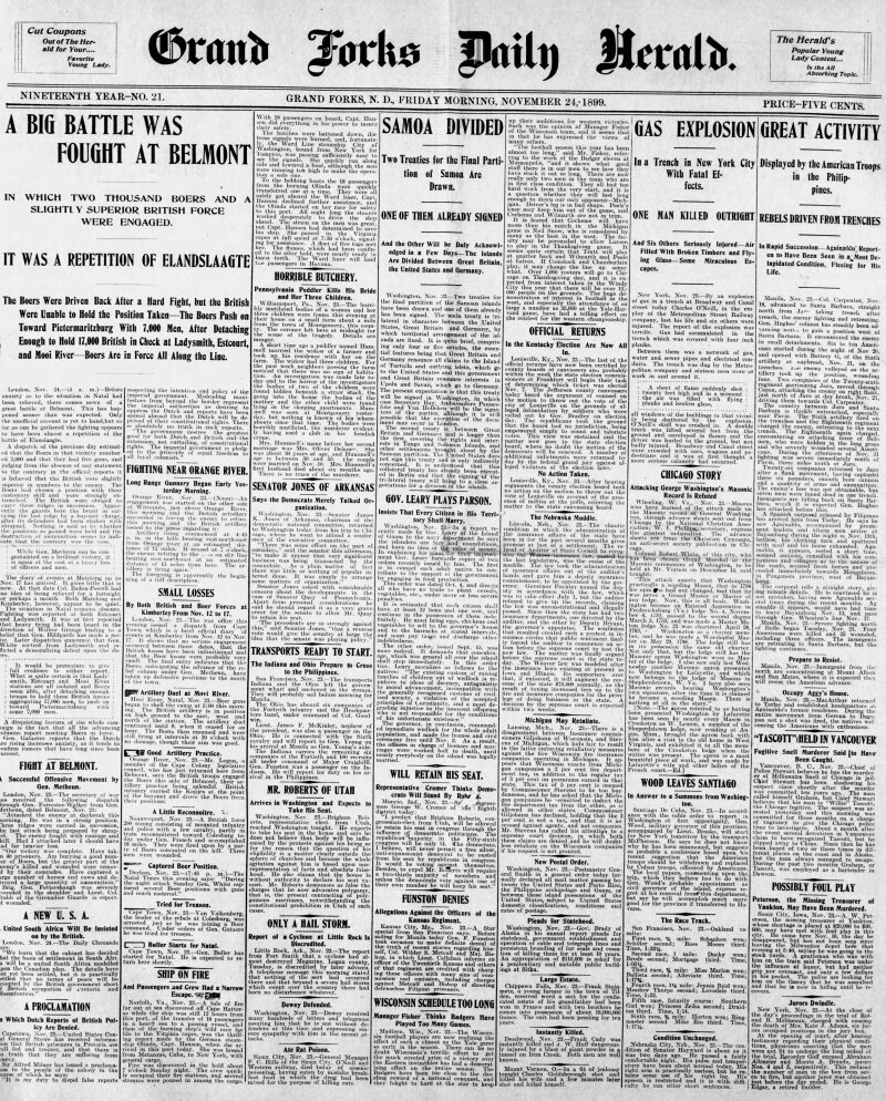 On November 24, 1899, the Grand Forks Herald reported significant business growth for the Northern Express Company in Grand Forks, with plans for an office relocation to accommodate the increased demand. The company nearly doubled its business throughout the year, indicating a robust economic environment in the area.